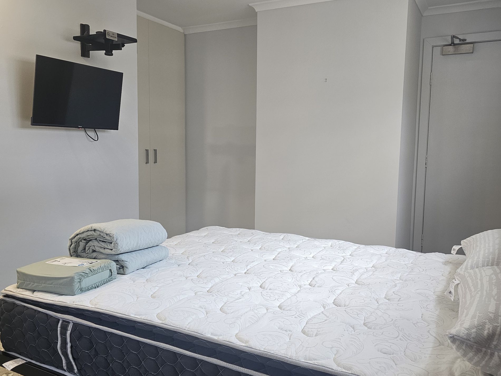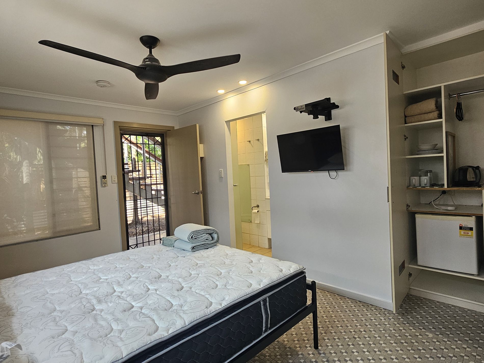 Light and airy bedsit layout with queen bed, air-conditioning and ceiling fan